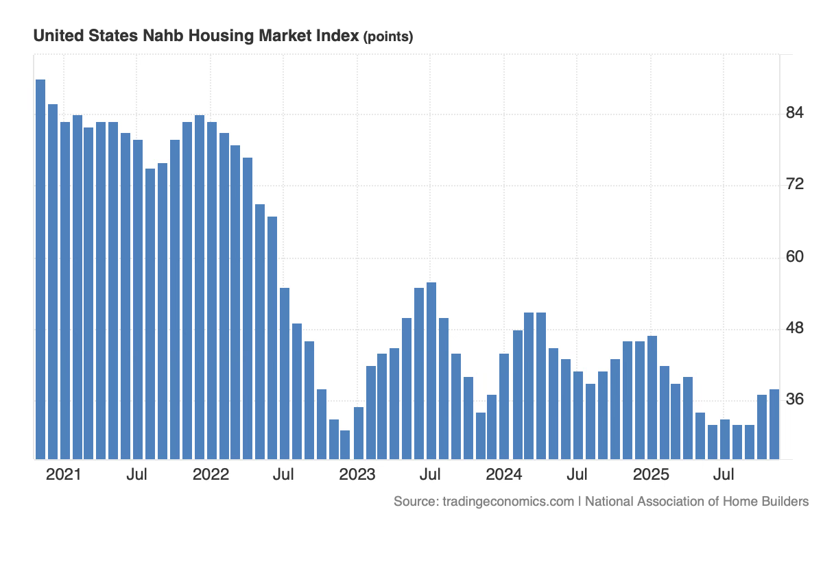 That posture shows up in sentiment. The NAHB/Wells Fargo Housing Market Index has spent most of 2025 stuck in the high-30s to low-40s, well below the 70+ readings of 2020–21 and below the 50 line that separates “good” from “bad.” Builders aren’t just moody. They’re behaving like people who think the easy part of the cycle is behind them.