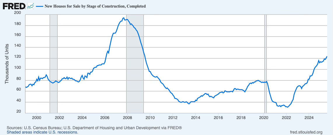 All of this is happening against the backdrop of more product that needs to move. New-home inventory has rebuilt meaningfully, and the stock of completed homes is back to levels last seen around the post-GFC period. For example, Census data shows to completed, ready-to-occupy inventory hitting the highest level since 2009 in mid-2025.