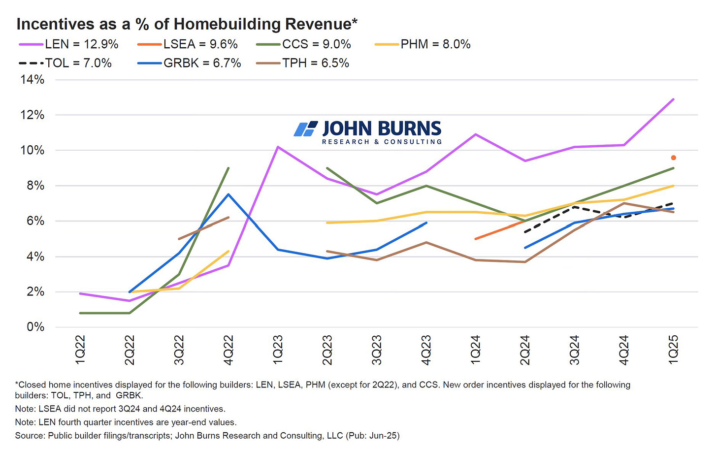 The real story here is incentives, not list prices. Official average selling prices can look flat to slightly up, but net prices after buydowns and credits are under real pressure. Lennar disclosed incentives averaging about 13% of the sales price in Q1 2025 and 13.3% in Q2, more than double what management describes as “normal.” The result is straightforward: builders are holding the sticker, cutting the deal underneath it, and you see the cost show up in compressed margins.