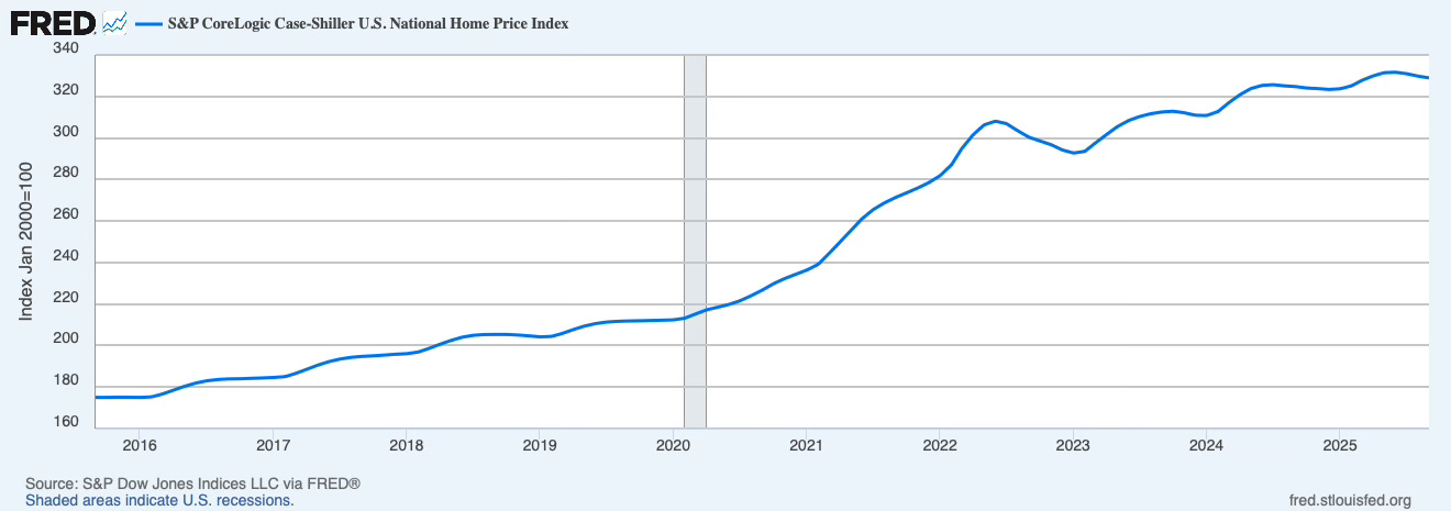 On the surface, the national price data look benign. Case-Shiller is up about 1.3% year-over-year through September 2025.