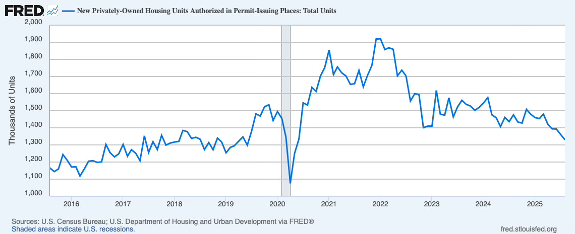 So it’s no surprise that single-family permits are down meaningfully from their 2021–22 peaks and have been choppy through 2025. They’re not collapsing, but they’re clearly decelerating. Exactly what you’d expect from an industry shifting from “expansion and scarcity pricing” to “cash-flow defense and asset-light.”