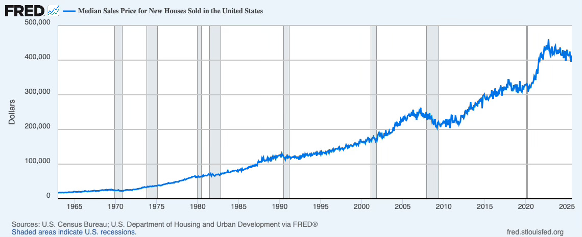 But new-construction is telling you something different. Census/HUD data show new-home prices clearly peaked in 2022 and have been slowly backsliding since. While builders defend contract prices with double-digit incentives and mortgage-rate buy downs that don’t show up in the headline median numbers.