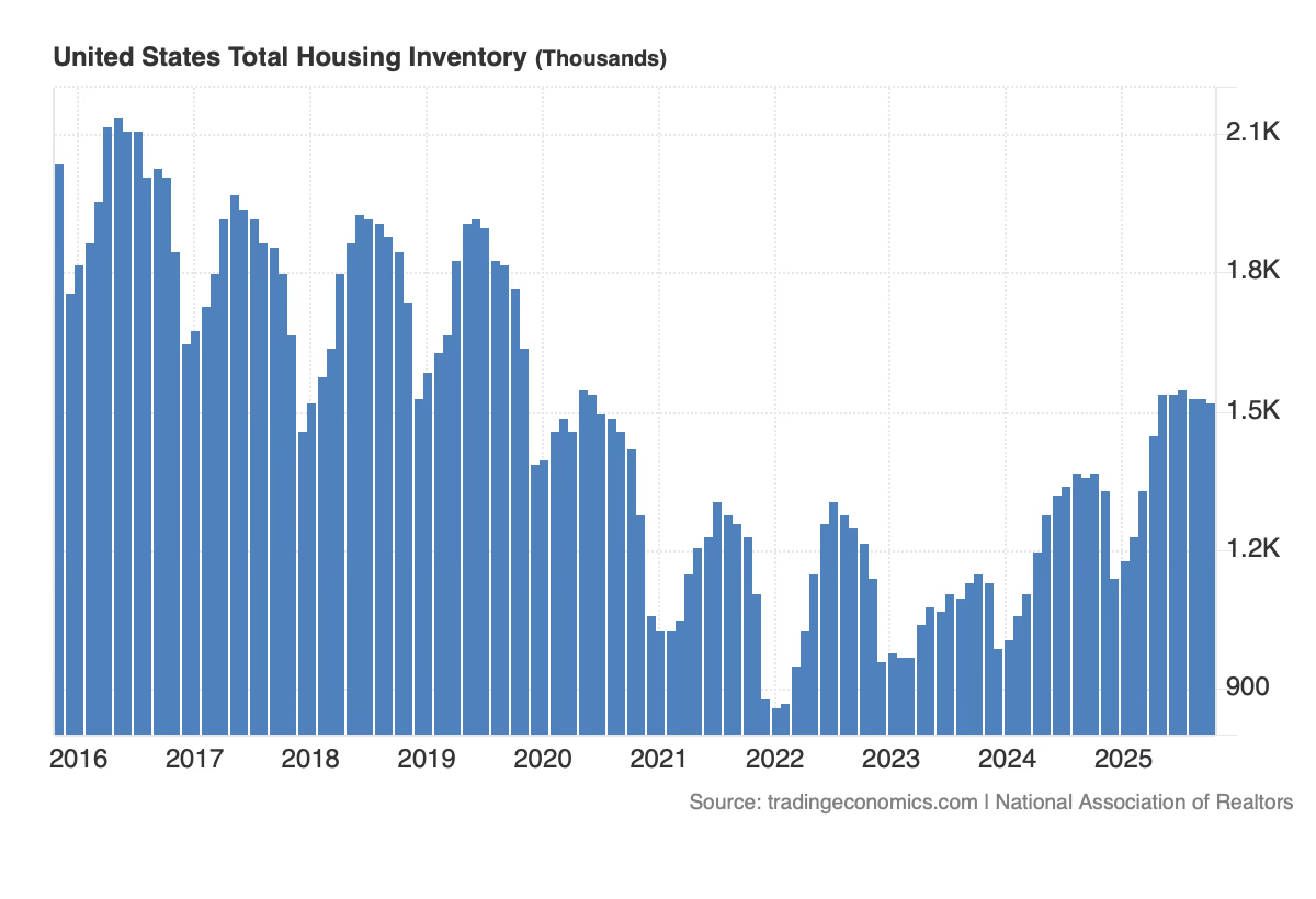 Inventory rebuilding, but unevenly. Existing inventory is ~1.52M (4.4 months) as of October 2025 but 18 states are already above pre-pandemic inventory levels, masking a big regional split.