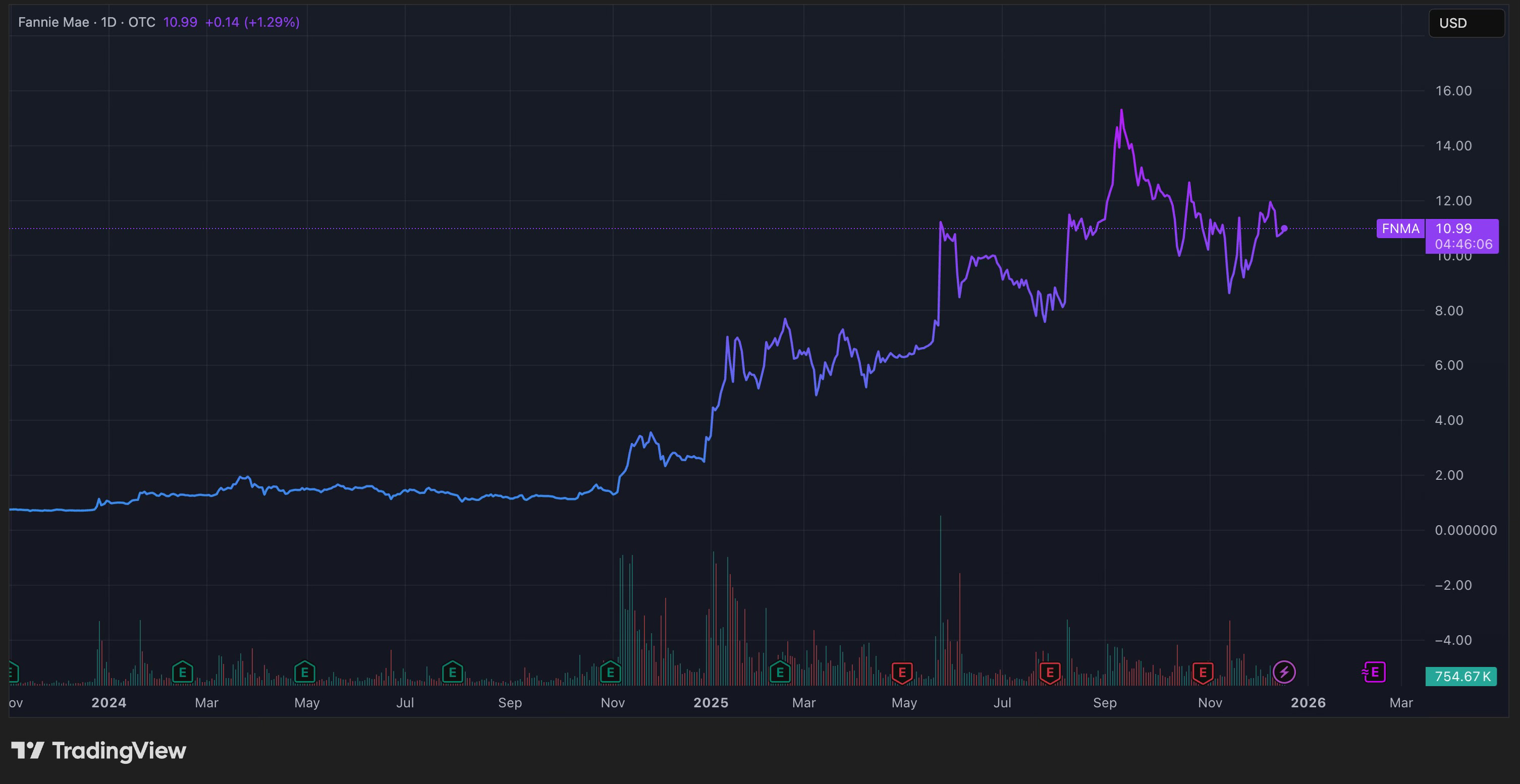 Fannie Mae common stock has run from $2 to $11—a fivefold move built entirely on anticipation of a deal that hasn’t happened yet. If a deal is struck, it will run much higher.