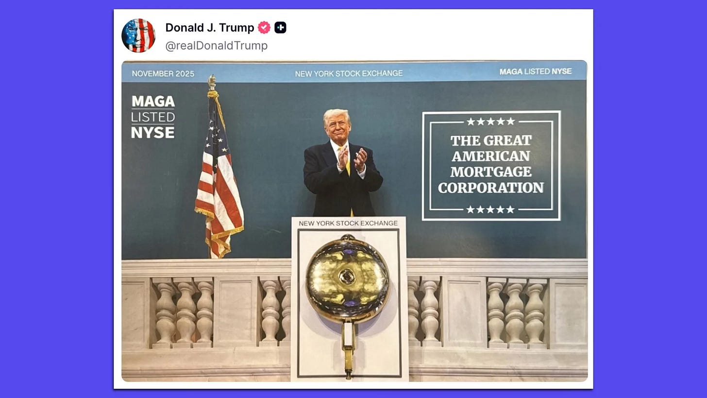The Trump administration has made ending the conservatorship a priority. Bill Pulte, the head of the Federal Housing Finance Agency, has floated Q1 2026 as a target date for an IPO. Trump himself has been posting AI-generated images of himself ringing the NYSE bell for “The Great American Mortgage Corporation”—a rebranded and privatized Fannie and Freddie.